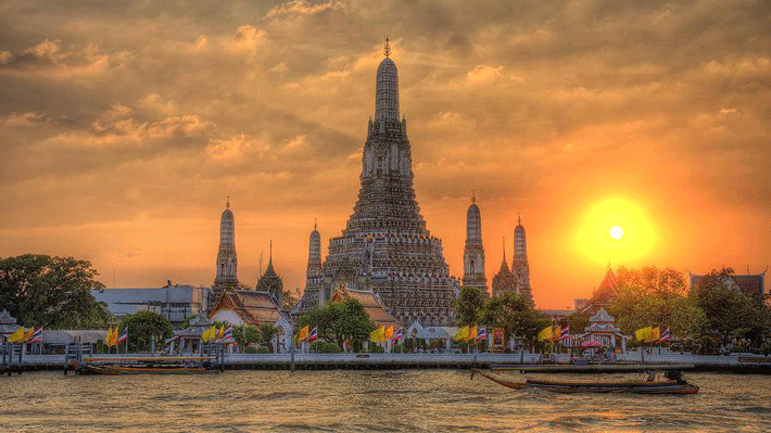 - Wat Arun ( chùa Bình Minh ) – ngôi chùa nằm trên bờ tây sông Chao Phraya, Thonburi. Đây là một trong những ngôi chùa cổ kính, hùng vĩ nhất Thái Lan , xung quanh các ngọn tháp, những mảnh kính hoặc gốm sứ nhỏ được trang trí, tạo màu sắc lộng lẫy, bắt mắt, làm nên nét đẹp riêng biệt cho điểm đến này.